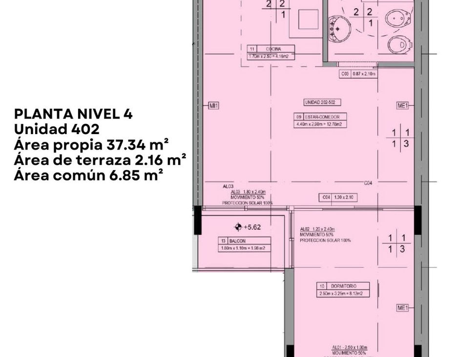 Superficie: 37,34 m² interiores + 2,16 m² terraza + 6,85 m² comunes